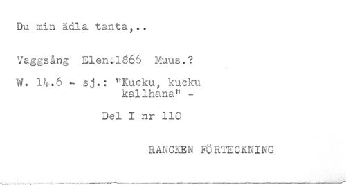 //// Du min ädla tanta,.. //// Vaggsång Elen.1366 Muus.? //// W. 14.6 - sj.: ^Kucku, kucku //// kallhana^ - //// Del I nr 110 //// RANCKEN FÖRTECKNING ////