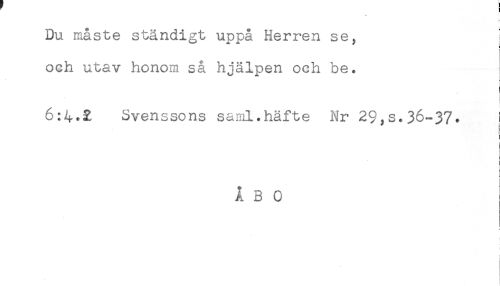 //// Du måste ständigt uppå Herren se, j //// och utav honom så hjälpen och be. //// 6:4.2 Svenssons saml.häfte Nr 29,s.36-37. j //// ÅBO ////