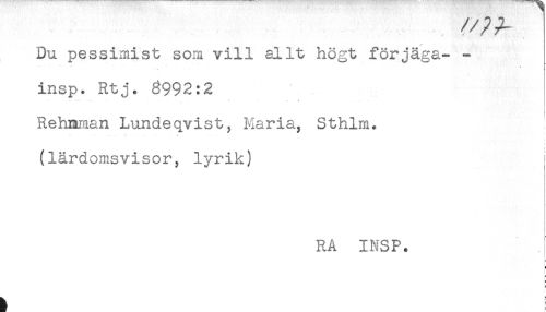 //// Dn pessimist som vill allt högt förjäga- - //// * //// insp. Rtj. 8992:2 //// . . : ^ - - . - . - .. - ... //// Rehnman Lundeqvist, Maria, Sthlm. //// (lärdomsvisor, lyrik) //// RA INSP. //// F //// = ////