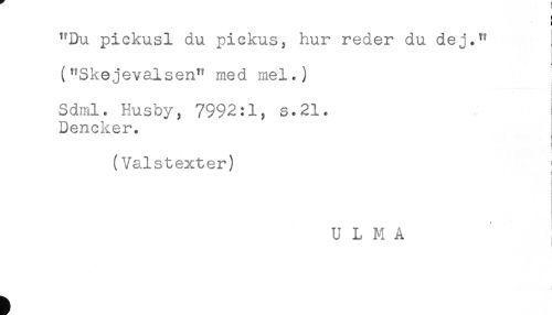 //// "Du pickusl du pickus, hur reder du dej." //// < //// ("Skejevalsen" med mel.) //// Sdml. Husby, 7992:1, s.21. //// Dencker. //// (Valstexter) i //// U L M A //// I ////