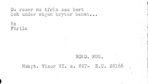 //// Du reser nu ifrån oss bort r //// Och under vägen bryter benet... ^ //// i //// f //// Hs //// Färila ' //// i //// j //// N(RD. MUS. : //// Mskpt. Visor VI. s. 837- E.U. 28166 ////