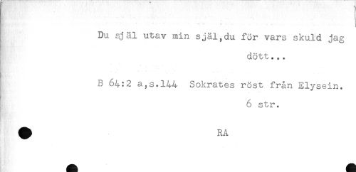 //// ' //// ' //// - //// ..... //// ; . . //// Du själ utav min själ,du för vars skuld jag //// dött... //// - //// ' - - . - .. . . //// B 64:2 a,s.l44 Sokrates röst från Elysein. //// 6 str. ////