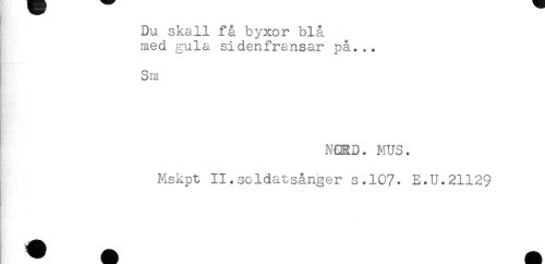 //// Du skall få byxor blå //// med gula sidenfransar på... //// Sm //// NCmo. MUS. //// Mskpt Il.soldatsånger s.107. E.U.21129 ////