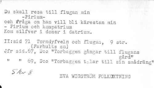 //// Du skall resa till flugan min //// -Pirium- //// och fråga om han vill bli kärestan min //// - Pirium och kompatrium //// Kom silfver i doner i datrium. //// II:sid 71 Torndyfveln och flugan, 9 str. //// (Farhults sn) //// Jfr sid.67, D:o "Torbaggen gångar till flugans //// gård" //// " " 69, D:o "Torbaggen talar till sin smådräng" //// j> ^^ Jr //// EVA WIGSTROM FOLKOKTNING ////