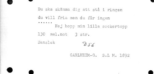 //// Du ska skäinma dig att stå i ringen //// du vill fria men du får ingen //// Hej hopp min lilla sockertopp //// 130 mel.not 3 str. //// Danslek //// CARLHEIM-G. S.L M. 1892 ////