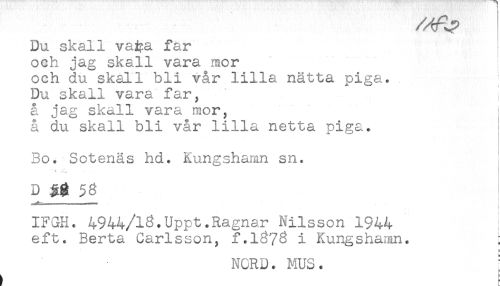 //// Du skall va#a far //// och jag skall vara mor [ //// och du skall bli vår lilla nätta piga. //// Du skall vara far, //// å jag skall vara mor, //// å du skall bli vår lilla netta piga. //// Bo. Sctenäs hd. Kungshamn sn. //// "s - . //// D 3g //// f ) //// ^- //// IFGH. 4944/13.Uppt.Ragnar Nilsson 1944 //// eft. Berta Carlsson, f.1373 i Kungshamn. } //// NCRU. MUS. //// <- ////