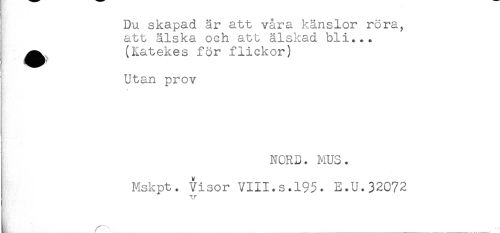 //// Du skapad är att våra känslor röra, //// att älska och att älskad bli... //// (Katekes för flickor) //// H Hr //// : //// ! Utan prov //// NORD. MUS. //// Mskpt. Visor VIII.s.195. E.U.32072 //// V //// L r . .. ___ ___ ////