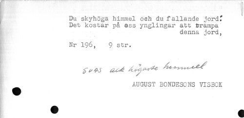 //// Du skyhöga himmel och du fallande jordf //// Det kostar på ass ynglingar att trampa //// denna jord, //// Nr 196, 9 str. //// AUGUST BONDESONS VISBOK //// t ^ ^ ////