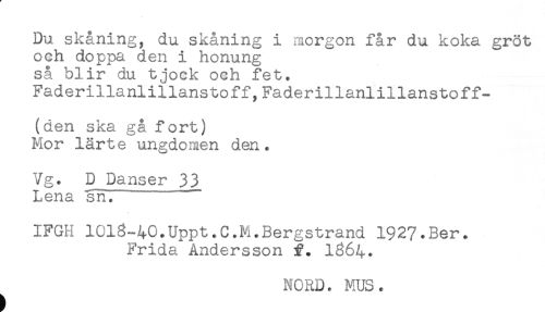 //// Du skåning, du skåning i morgon får du koka gröt //// och doppa den i honung //// så blir du tjock och fet. //// Faderillanlillanstoff,Faderillanlillanstoff- //// (den ska gå fort) //// Mor lärte ungdomen den. //// Vg. D Danser 33 //// Lena sn //// /IFGH 101g-40.Uppt.C.M.Bergstrand 1927.Ber. //// Frida Andersson f. 1664. //// NORD. MUS. ////