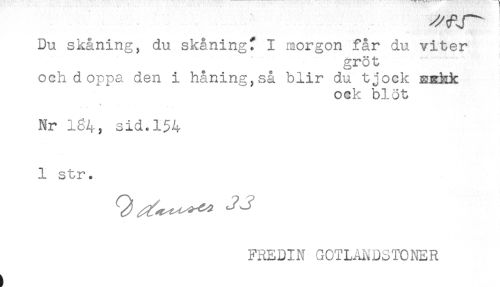 //// ^J^ ! //// Du skåning, du skåningf I morgon får du viter //// gröt //// och doppa den i håning,så blir du tjock EHEkk //// ock blöt //// v //// Nr 164, sid.154 //// 1 str. //// FHEDIN GOTLAI\DSTONER ////