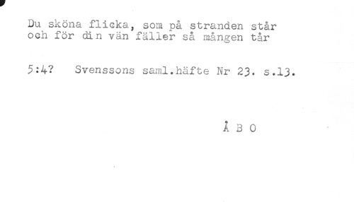 //// Du sköna flicka, som på stranden står //// och för din vän fäller så mången tår //// 5:4? Svenssons saml.häfte Nr 23. s.13. //// ÅBO ////