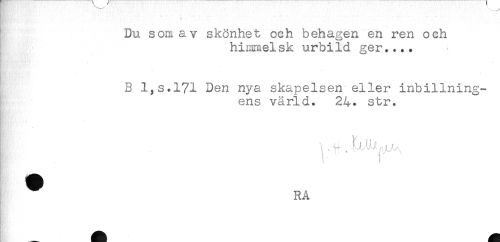 //// ' Du som av skönhet och behagen en ren och //// himmelsk urbild ger.... //// .... //// B l,s.l?l Den nya skapelsen eller inbillning- //// ens värld. 24* str. //// RA ////