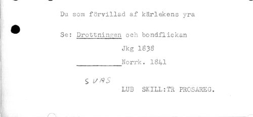 //// Du som förvillad af kårlekens yra //// Se: Drottningen och bondflickan //// wa.muMc-Ht- nMnu.:)« u mm a..... //// ] Jkg 1836 //// _Norrk. 1641 //// $ y - //// LUB SKILL:TR PROSAREG. //// / .... ....... //// /