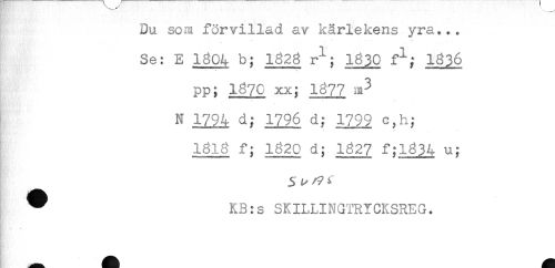 //// Du som förvillad av kärlekens yra... //// - - : *- - - 1 . . //// - - . ... //// Se: E 1804 b; 1828 r^; I83C I836 //// PP; I87C xx; 1877 m3 //// . ' * ^ //// N 1794 d; 1796 d; 1799 c,h; //// * ^ . //// 1818 f; 1820 d; 1827 f;l834 u; //// ^ KB:s SKILLINGTRYCKSREG. ////