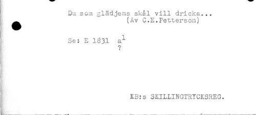//// ! Du som glädjens skål vill dricka... //// ^ (Av C.E.Petterson) //// Se: E 1331 a^ //// ? //// KB:s SKILLINGTRYCKSREG. ////