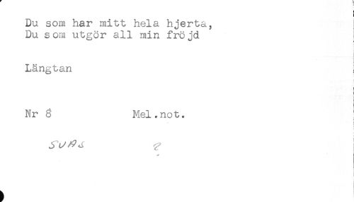 //// !! //// Du som har mitt hela hjerta, //// Du som utgör all min fröjd //// j //// Längtan //// I //// Nr 3 Mel.not. //// { //// t//?^ //// t //// i //// i //// I ////