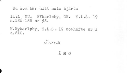 //// Du som har mitt hela hjärta //// 11:4 MU. NYkarleby, OR. S.L.S. 19 //// s.186-188 nr 58. //// N.Nykarlpby, S.L.S. 19 nothäfte nr 1 //// s.810. //// ÅBO ////