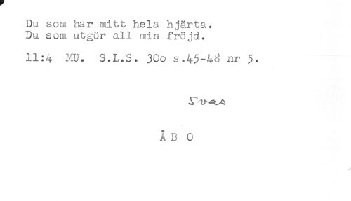 //// Du som har mitt hela hjärta. //// Du som utgör all min fröjd. //// 11:4 MU. S.L.S. 30o s.45-43 nr 5. //// ÅBO ////
