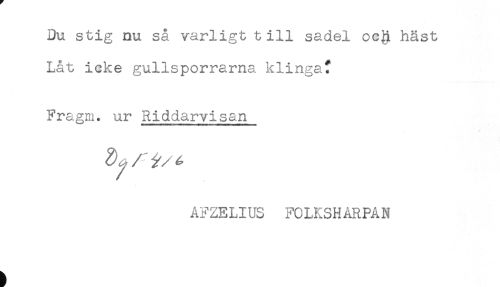 //// Du stig nu så varligt till sadel oe^ häst //// Låt icke gullsporrarna klingat //// Fragm. ur Riddarvisan //// AFZELIUS FCLKSHARPAN ////