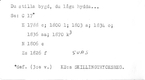 //// Du stilla bygd, du låga hydda... //// Se: C 17" //// E 1788 c; 1800 1; 1803 a; I834 o; //// 1836 aa; 1870 k^ //// N 1806 c //// Zzl826 f St^P^ //// +def. (3:e v.) KB:s SKILLINGTRYCKSREG. ////