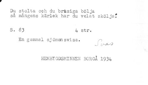 //// Du stolta och du brmsiga bölja //// så mångens kärlek har du velat sköljaf //// S. 33 4 str. //// En gammal sjömaisvisa. //// J //// HEMBTGDSMINNEN BORGÅ 1934 ////