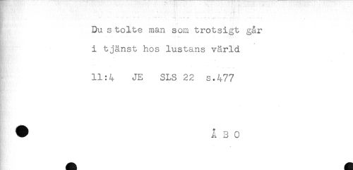 //// - * * - - - v .< //// Du stolte man som trotsigt går //// i tjänst hos lustans värld //// 11:4 JE SLS 22 s.477 //// w ////
