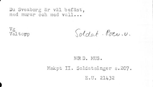 //// Du Sveaborg är väl befäst, //// med murar och med vall... //// Val t opp - - ^ - //// N(RD. MUS. //// Mskpt II. Soldatsånger s.207. //// E.U. 21432 ////