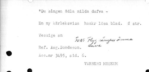 //// "Du sången ädla milda dufva - //// En ny kärleksvisa haskr lösa blad. 3 str. //// Vessige sn ^ ^ //// Ref. Aug.Bondeson. ^^ //// ^ Acc.nr 3495, sid. 6. //// VARBERG MUSEUM ////