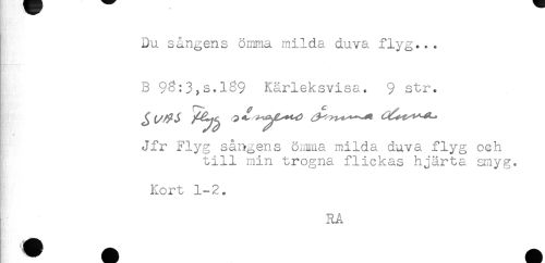 //// Du sångens ömma milda duva flyg... //// B 98:3,s.189 Kärleksvisa. 9 str. //// ^(/^J ^^^^ //// Jfr Flyg sångens ömma milda duva flyg och //// till min trogna flickas hjärta smyg. //// * //// Kort 1-2. //// RA ////