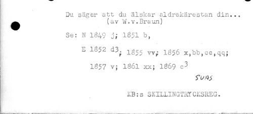 //// j Du säger att du älskar aldrakärestan din... //// ^ (av W.v.Braun) //// ' ! ^ //// Se: N 1849 j; 1851 b, //// M //// - //// E 1852 d3. ig^ X,bb,cc,qq; //// 1857 v; 1861 xx; 1869 c^ //// KB:s SKILLINGTRY CKSREG. ////