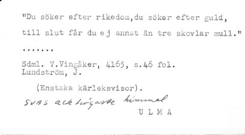 //// ^Du söker efter rikedom,du söker efter guld, //// till slut får du ej annat än tre skövlar mull." //// Sdml. V.Vingåker, 4165, s.46 fol. //// Lundström, J. //// (Enstaka kärleksvisor). //// U L M Ä ////