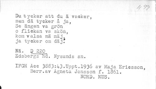 //// Du tycker att du ä vacker, //// men dä tycker å ja, //// Se ängen va grön //// o flickan va skön, //// kom valsa mä mäj, //// ja tycker om däj. //// j //// : //// Nä. D 220 //// Edsbergs hd. Nysunds sn. //// ... . * * - *-- - .. - //// i //// IFGH Acc 3863:43.Uppt.1936 av Maja Ericsson, //// Berr.av Agneta Jonsson f. 1861. //// NORD. MUS. ////