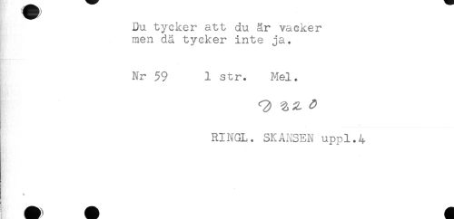 //// Du tycker att du år vacker //// men dä tycker inte ja. //// Nr 59 1 str. Mel. //// RINGL. SKANSEN uppl.4 ////