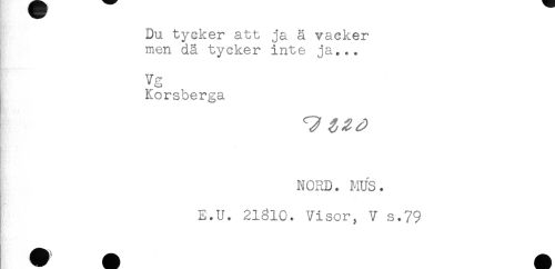 //// Du tycker att ja ä vacker //// men då tycker inte ja... //// Vg //// Korsberga //// * //// - //// NORD. MUS. //// E.U. 21S10. Visor, V s.79 ////
