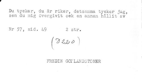 //// Du tycker, du är riker, detsamma tycker jag, //// sen du mig övergivit ock en annan hållit av //// Nr 57, sid. 49 2 str. //// f 3 , ^ ^ ) //// FREDIN GCfLÅNDSTONER //// * ////