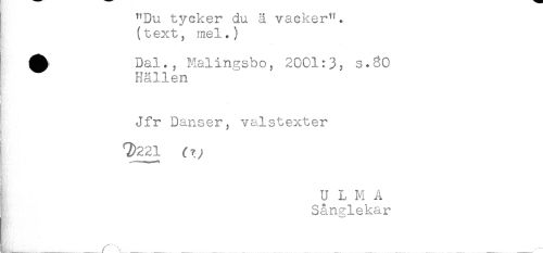 //// "Du tycker du a vacker". //// (text, mel.) //// ^ Dal., Malingsbo, 2001:3? s*80 //// Hällen //// Jfr Danser, valstexter //// T)221 ( ? ; //// t ULM A //// ) Sånglekar ////
