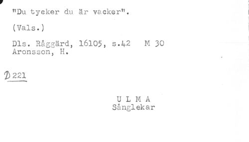 //// < //// "Du tycker du är vacker* . //// (Vals.) //// Dis. Råggärd, 16105, s*42 M 30 //// Aronsson, H. //// U L M Å //// Sånglekar ////