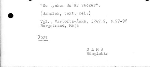 //// ""Du tycker du är vacker", //// ^ (danslek, text, mel.) //// Vgl., Vartofta-Åska, 3247:9, s.97-93 //// j Bergstrand, Maja //// /' 221 //// U L M A //// Sånglekar ////