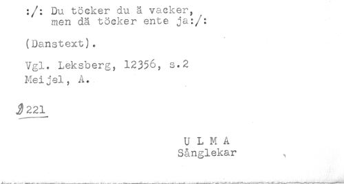 //// ; / ; DU u U LA LA CL V cl U1Y t? i , //// men dä tocker ente ja:/: //// (Danstext). //// Vgl. Leksberg, 12356, s.2 //// Meijel, A. //// U L M A //// Sånglekar , //// ^___-- -. .... -____ - ... .. ^-..__---'***--.-----'---.-<---^----<- -. --- ////