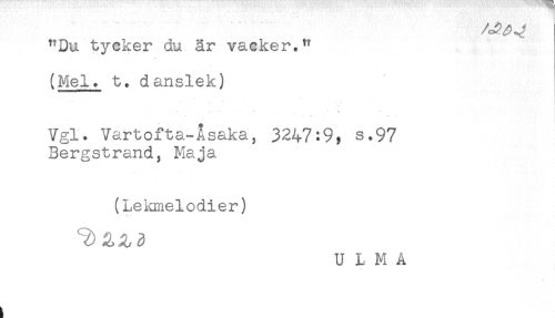 //// ^Du tycker du är vacker.^ //// (Mel. t. danslek) //// * å* ^ - . , //// ! * //// . .. ^ - - . - . //// Vgl. Vartofta-Åsaka, 3247:9^ s.97 //// Bergstrand, Maja //// (Lekmelodier) ////
