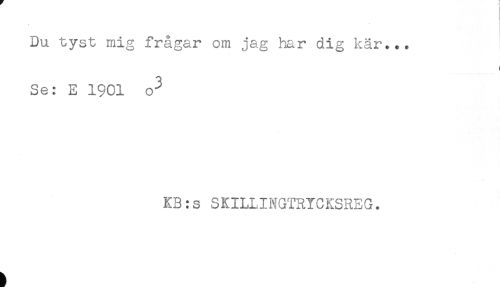 //// Du tyst mig frågar om jag har dig kär... //// i //// Se: E 1901 o^ //// KB:s SKILLINGTRYCKSREG. ////