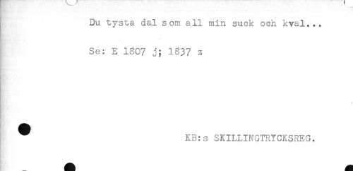 //// ; Du tysta dal som all min suck och kval... //// i- //// Se: E 1607 j; 1837 Z //// ^ KB:s SKILLINGTRYCKSREG. //// -! //// Bt&f^. ////