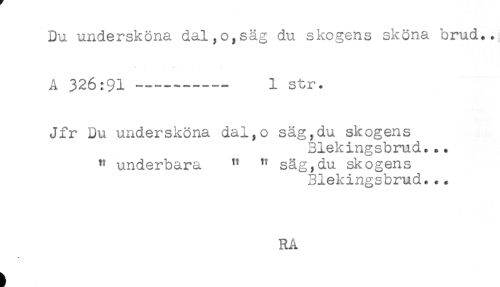 //// Du undersköna dal,o,säg du skogens sköna brud.. //// A 326:91 ---1 str. //// Jfr Du undersköna dal,o säg,du skogens //// Blekingsbrud... //// " underbara " " säg,du skogens //// Blekingsbrud... //// RA ////