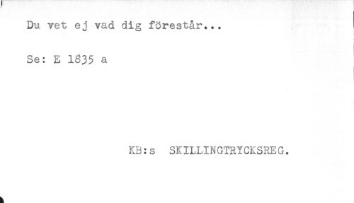 //// Du vet ej vad dig förestår... //// * //// Se: E 1335 a //// KB:s SKILLINGTRYCKSREG. ////