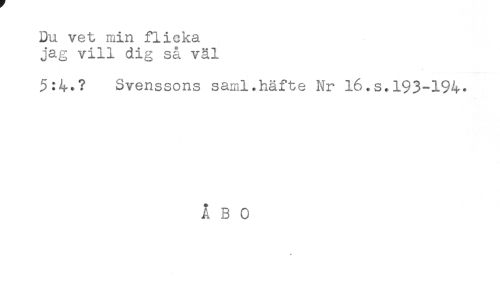 //// Du vet min flicka //// jag vill dig så väl //// 5:4.? Svenssons saml.häfte Nr l6.s.193-194. //// ÅBO ////