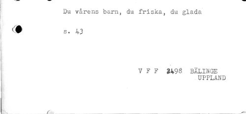 //// Du vårens barn, du friska, du glada //// <3 s. 43 //// * //// V F F 3498 BÄLINGE //// UPPLAND //// r _ _ ____ _ ___ ___ _____- ////