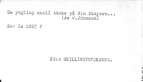 //// Du yngling skall tänka på din Skapare... //// (Av J.Jönsson) //// Se: Zz 1627 f //// i //// i //// i //// r //// E //// < //// - //// i //// KB:s SKILLINGTRYCKSREG. //// * //// . //// L //// < ////