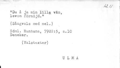 //// "Du å ja min lill& vän, //// levom förnöjd." //// (Sångvals med mel.) //// Sdml. Runtuna, 7922:5, s.10 //// Dencker. //// I //// (Valstexter) //// i //// < //// i //// U L M A ////