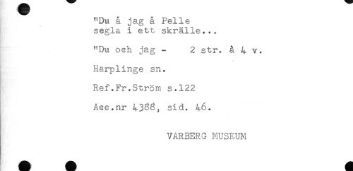 //// ^Du å jag å Pelle //// segla i ett skrälle... //// "Du och jag - 2 str. å 4 v. //// Harplinge sn. //// Ref.Fr.Ström s.122 //// Aec.nr 4338, sid. 46. //// VARBERG MUSEUM ////