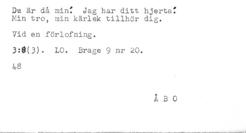 //// Du är da min. Jag har ditt hjerta. //// Min tro, min kärlek tillhör dig. //// Vid en förlofning. //// 3:8(3). LO. Brage 9 nr 20. //// 48 //// A B 0 ////